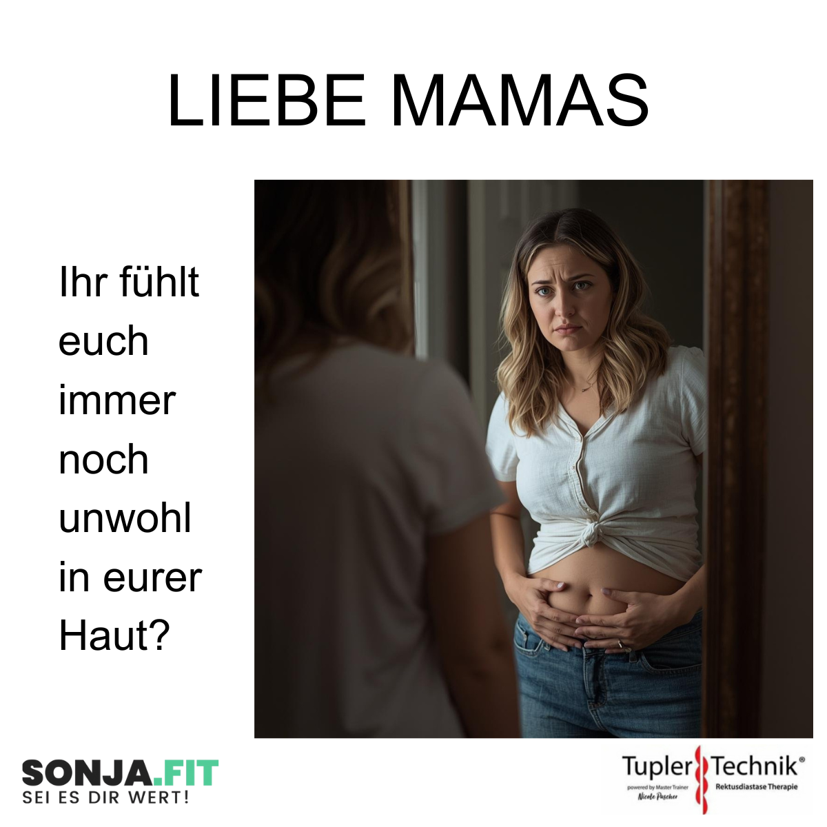 Es geht nicht um Schwangerschaftspfunde – es geht um die Stabilität eures Rumpfes. Vielleicht ist noch oder wieder eine Rectusdiastase da. Diese kann verschiedene Formen haben: Am Bauchnabel zwischen den geraden Bauchmuskeln wirkt sie vielleicht schmal, am Unterbauch ist sie aber weiter geöffnet – oder umgekehrt. Wenn ihr mit gehobenem Kopf abtastet, achtet darauf, wie tief eure Finger in den Spalt reichen. Selbst eine schmale Distanz kann eine tiefe Lücke bedeuten und auf eine vorhandene Rectusdiastase hinweisen.