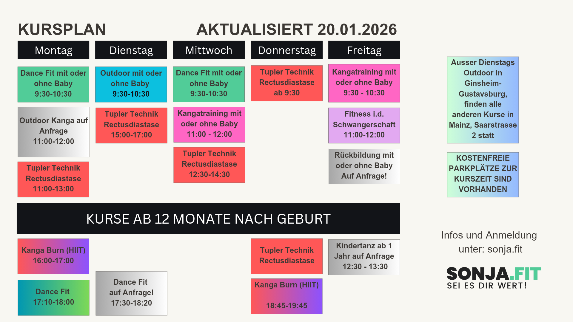 Kanga Burn® - Fitness ab ca. 12Monate nach Geburt. Wir könne auch über den individuellen Fitnessstand sprechen, dann kannst du evtl. auch früher starten.